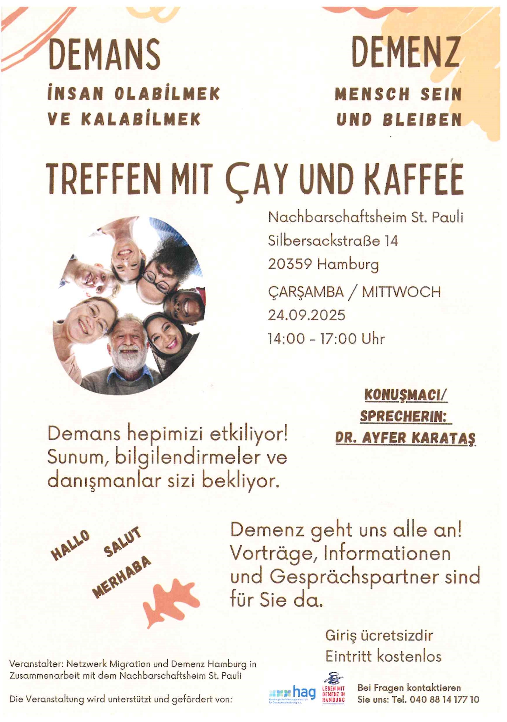 Im Nachbarschaftsheim St. Pauli findet eine Informationsveranstaltung zum Thema Demenz statt. Danach kann sich an mehreren Informationsständen zu diesem Thema und dem Älterwerden in Hamburg ingesamt informiert werden.