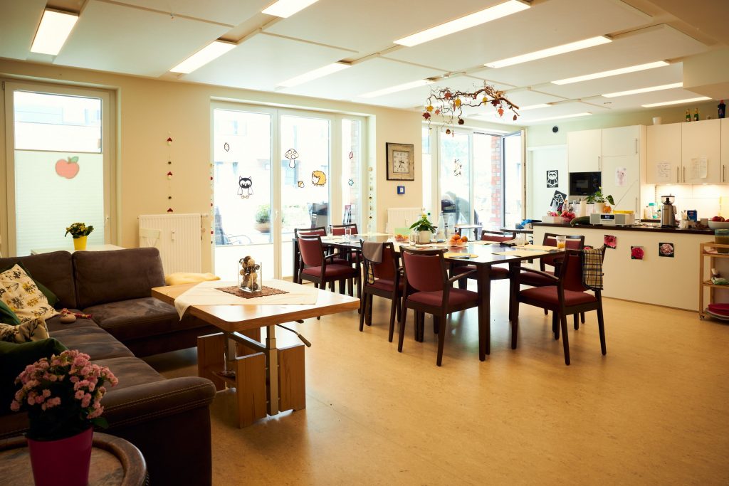 Der Pflegedienst ist rund um die Uhr präsent und bietet den Bewohnern durch ein festes Team eine kontinuierliche und dadurch vertraute Begleitung und Unterstützung im häuslichen und pflegerischen Alltag. In der WG wird täglich gekocht und die individuellen Bedürfnisse der Bewohner in die Tagesplanung einbezogen. So gibt es beispielsweise keine feste Frühstückszeit. Jeder Bewohner kann seinem persönlichen Rhythmus entsprechend den Tag beginnen und in der offenen Gemeinschaftsküche frühstücken kommen. Regelmäßig ist der Therapiehund „Fiete“ in der WG, der allen Anwesenden große Freude bereitet.